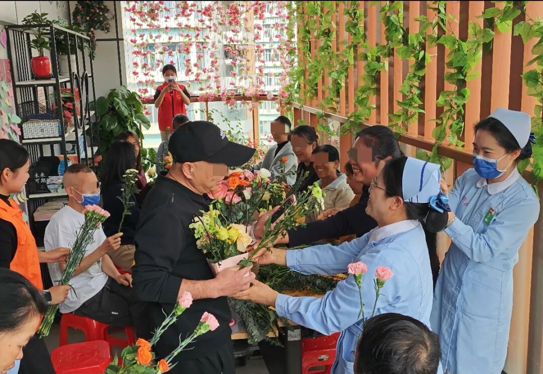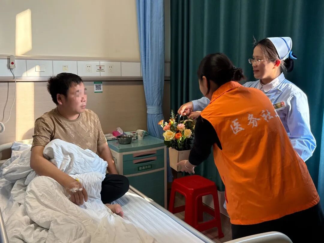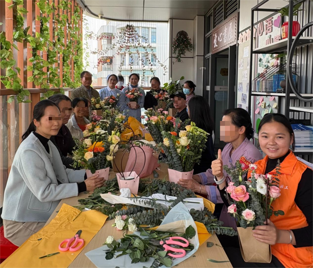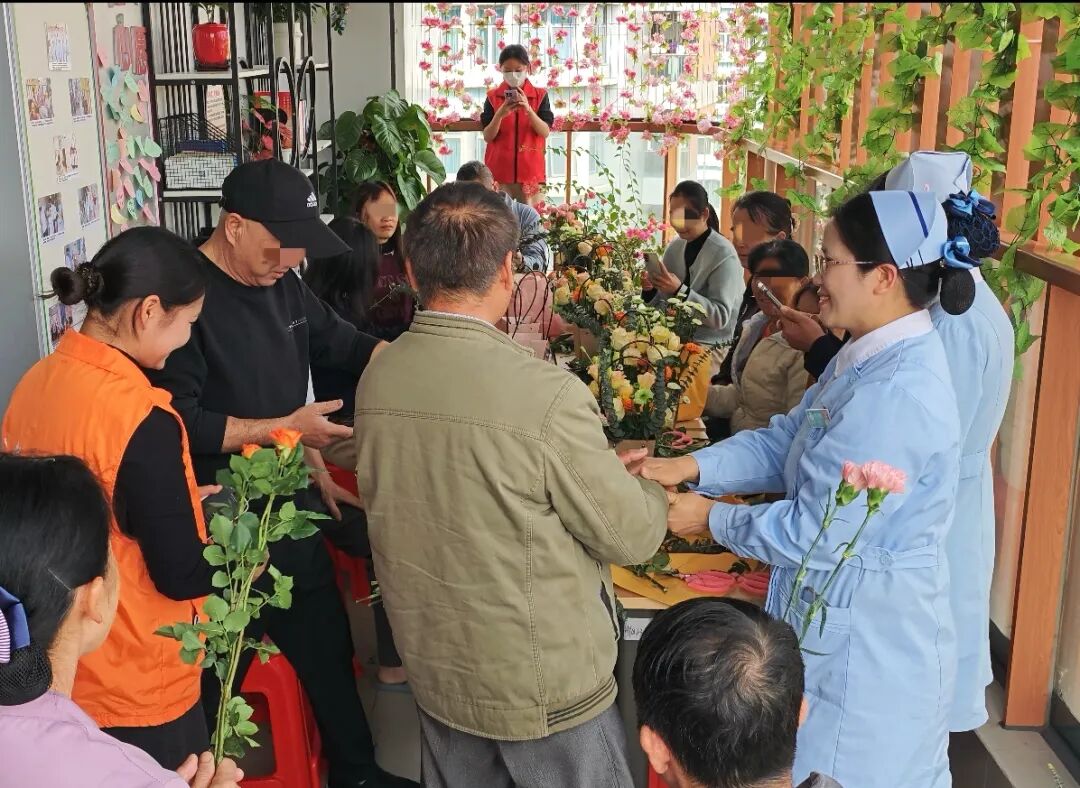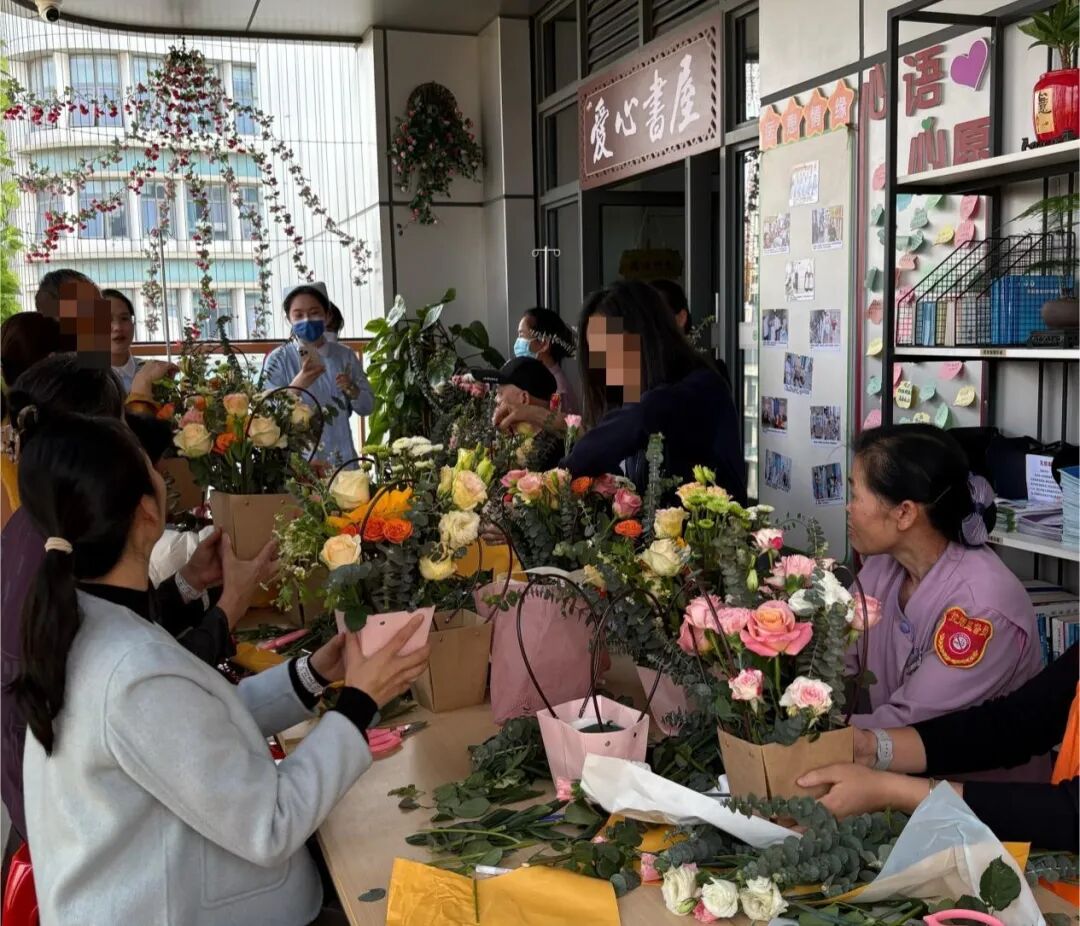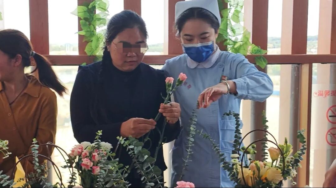 一花一叶皆有情,一枝一束藏心愿。插花环节中,医务社工引导患者静心冥想,默念心中的康复期盼,将注意力从身体的不适转移到内心的平和感受之上。针对行动不便的患者,医护人员与志愿者全程贴心帮扶,细致协助修剪花枝、搭配花材;面对沉默犹豫、不愿表达的患者,社工温柔耐心地耐心引导,慢慢打开他们的心扉。病房内花香萦绕、暖意融融,大家凝神执剪、悉心搭配,将对康复的向往、心底的情愫,一一融入每一束花艺作品中,让朵朵鲜花、片片绿叶,都成为独属于自己的心灵独白与情感寄托。