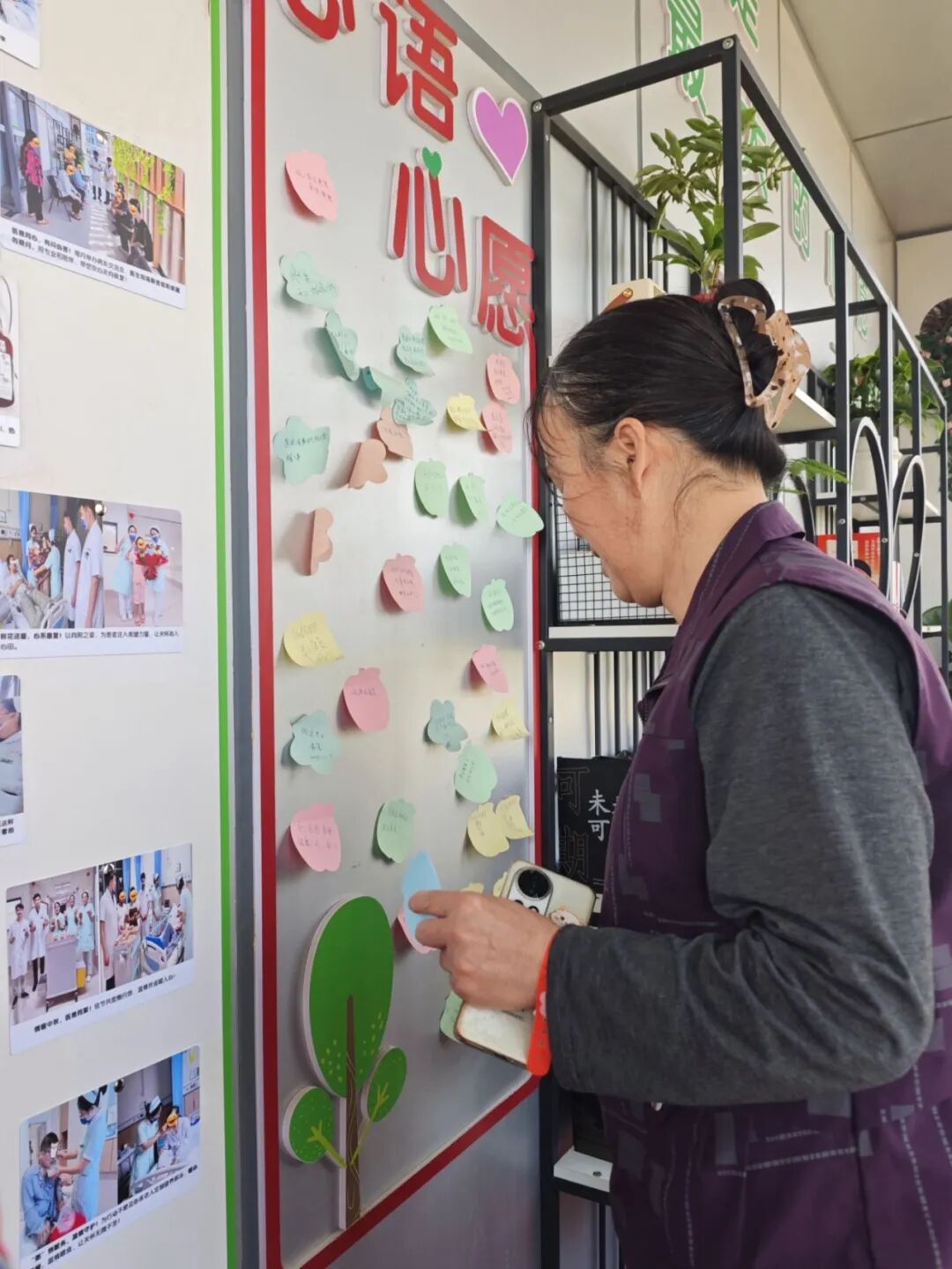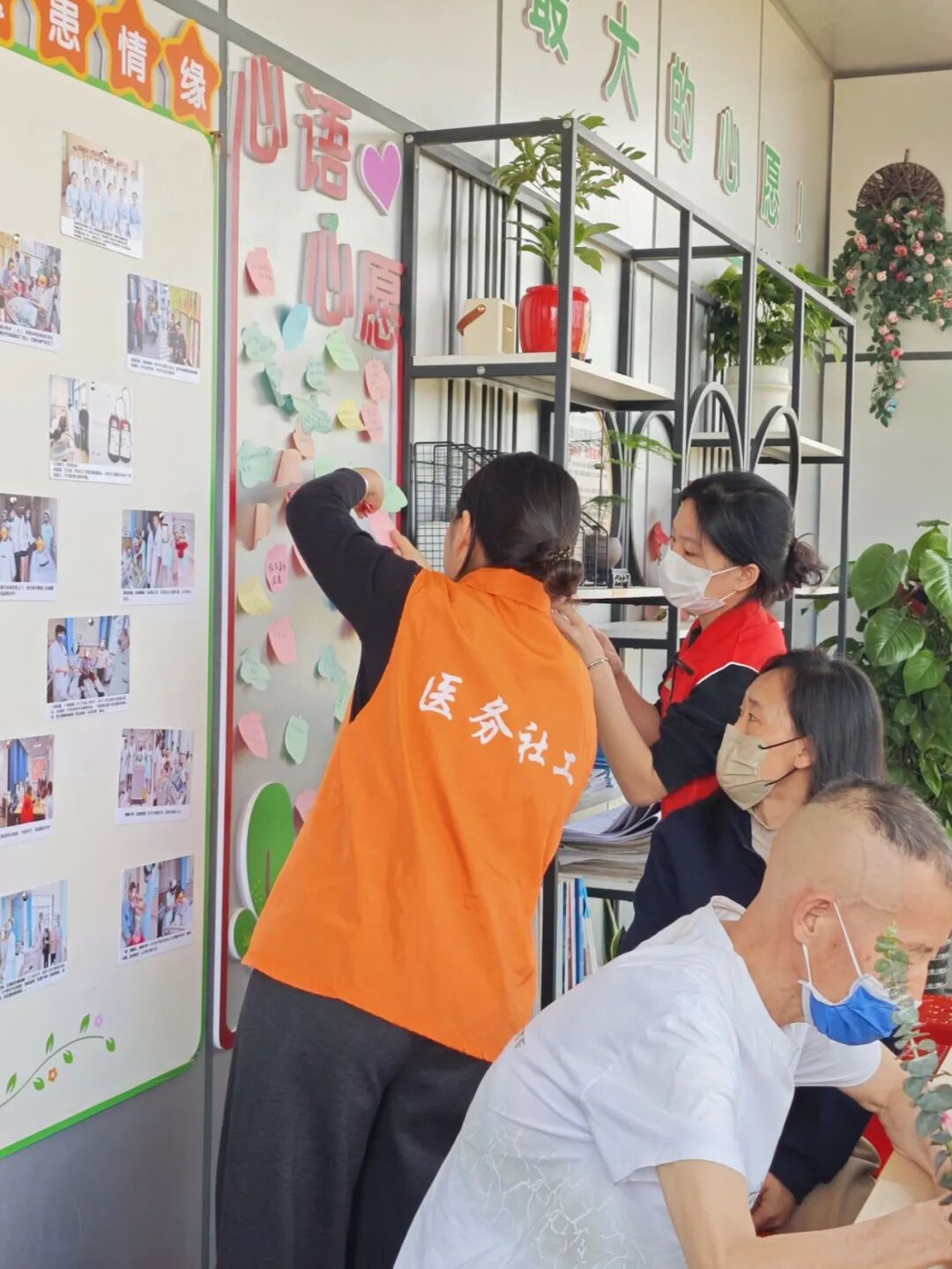 活动伊始,医务社工引导患者将当下的心情与康复心愿书写在便签上,让心底的情绪自然外化,缓缓开启这场专属的心灵疗愈之旅。随后,社工向大家阐释了表达性艺术治疗“花艺无对错,感受最珍贵”的核心理念,明确了尊重、包容、真诚的团体互动规则。现场氛围逐渐升温,两名患者主动献唱,医护人员也欣然加入,悠扬的歌声驱散了病房的沉闷,漾满融融暖意,大家在轻松安心的氛围中,正式开启了与鲜花的美好相遇。